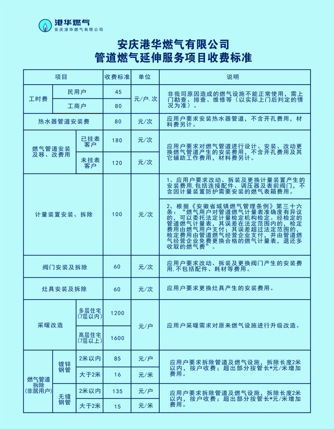 隨著安慶城市燃?xì)饨ㄔO(shè)的快速發(fā)展,人民群眾生活水平的提高,在保障了用戶基本用氣需求的前提下,燃?xì)庥脩魧艿廊細(xì)獾难由旆?wù)有了更多更高的要求。為滿足用戶的個(gè)性化需求,我司按照“國辦函〔2020〕129號”文件精神,結(jié)合實(shí)際情況和市場同類服務(wù)標(biāo)準(zhǔn),按照用戶自愿、有償服務(wù)、合理收益、便于操作的原則,制定了以下延伸服務(wù)收費(fèi)標(biāo)準(zhǔn),定于2021年9月6日起執(zhí)行。