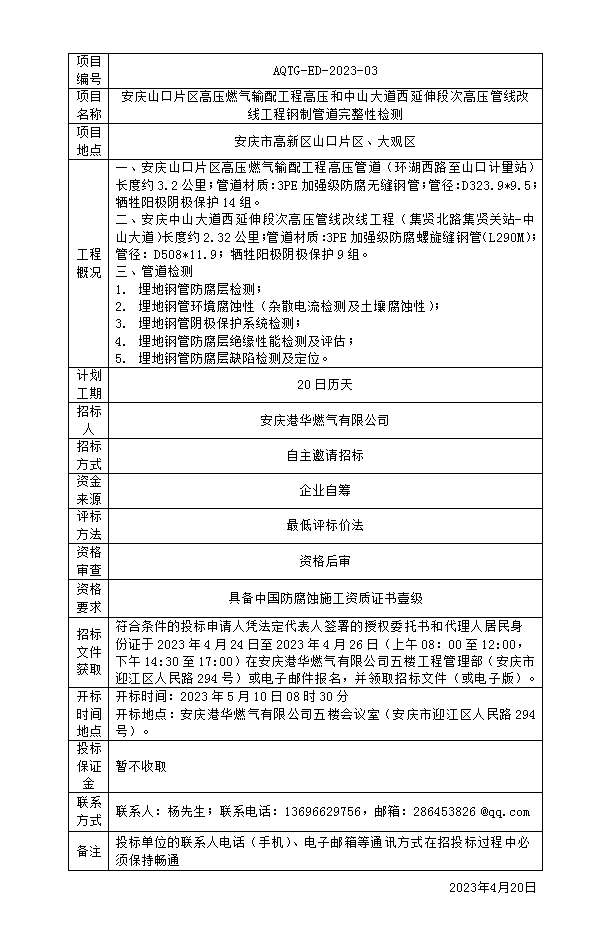 安慶山口片區(qū)高壓燃氣輸配工程高壓和中山大道西延伸段次高壓管線改線工程鋼制管道完整性檢測招標公告