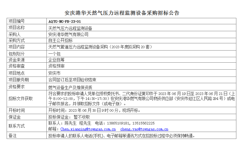 安慶港華天然氣壓力遠程監(jiān)測設(shè)備采購招標公告 發(fā)布時間:2023-06-16    閱讀次數(shù):3324次