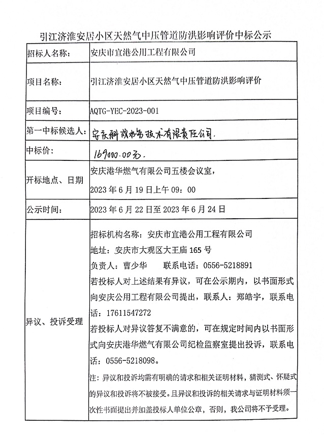 引江濟(jì)淮安居小區(qū)天然氣中壓管道工程防洪影響評價中標(biāo)公示