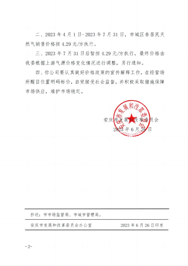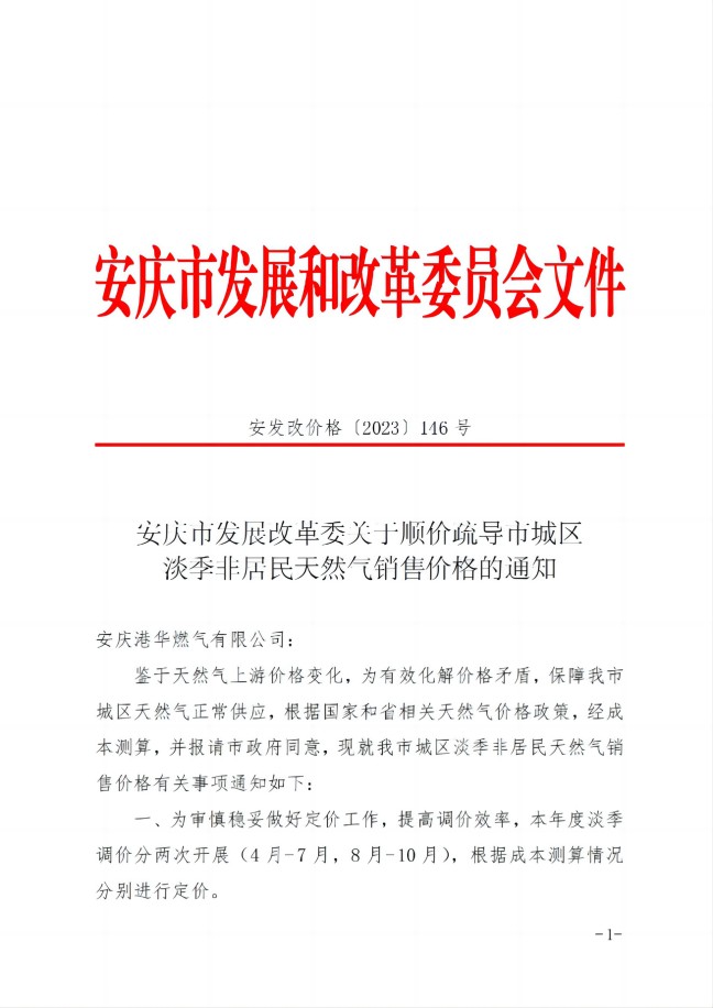 安慶市發(fā)展改革委關(guān)于順價(jià)疏導(dǎo)市城區(qū)淡季非居民天然氣銷(xiāo)售價(jià)(2023)格的通知
