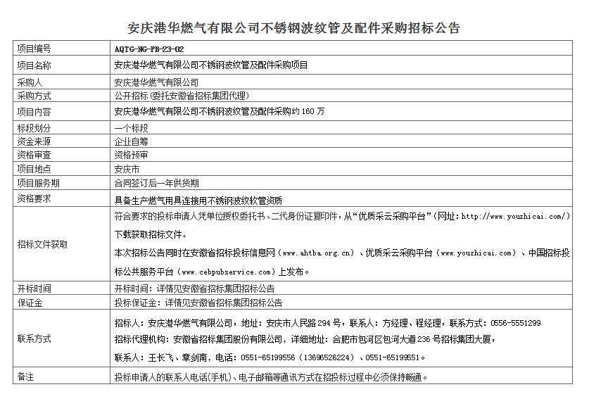 安慶港華燃?xì)庥邢薰静讳P鋼波紋管及配件采購(gòu)招標(biāo)公告