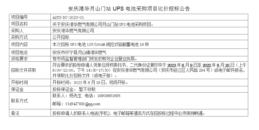 安慶港華月山門站UPS電池采購(gòu)項(xiàng)目比價(jià)招標(biāo)公告 發(fā)布時(shí)間:2023-08-09    閱讀次數(shù):4437次