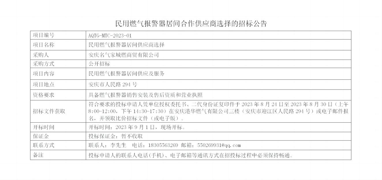 民用燃?xì)鈭缶骶娱g合作供應(yīng)商選擇的招標(biāo)公告 發(fā)布時間:2023-08-24    閱讀次數(shù):3591次