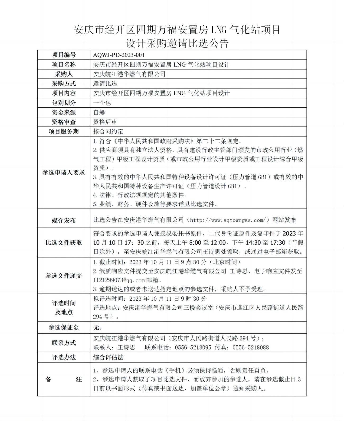 安慶市經開區(qū)四期萬福安置房LNG氣化站項目 設計采購邀請比選公告 發(fā)布時間:2023-09-27    閱讀次數(shù):3372次