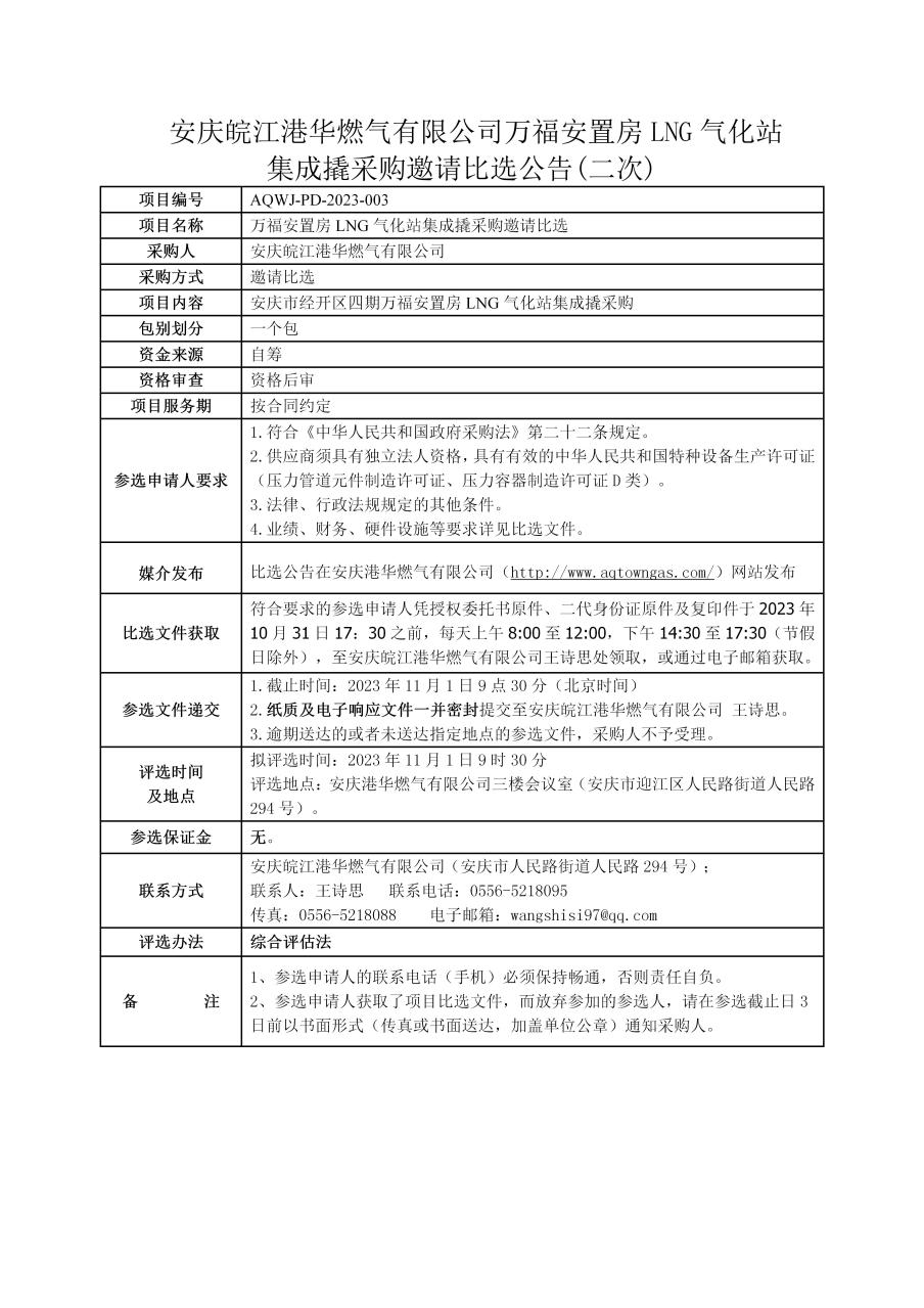 安慶皖江港華燃?xì)庥邢薰救f福安置房LNG氣化站集成撬采購(gòu)邀請(qǐng)比選公告(二次)