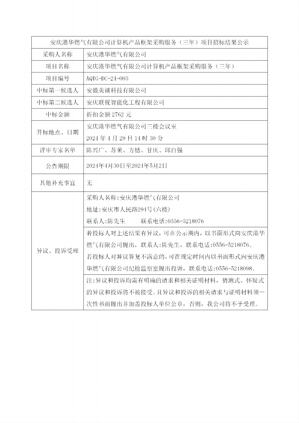安慶港華燃?xì)庥邢薰居嬎銠C(jī)產(chǎn)品框架采購服務(wù)(三年)項目招標(biāo)結(jié)果公示