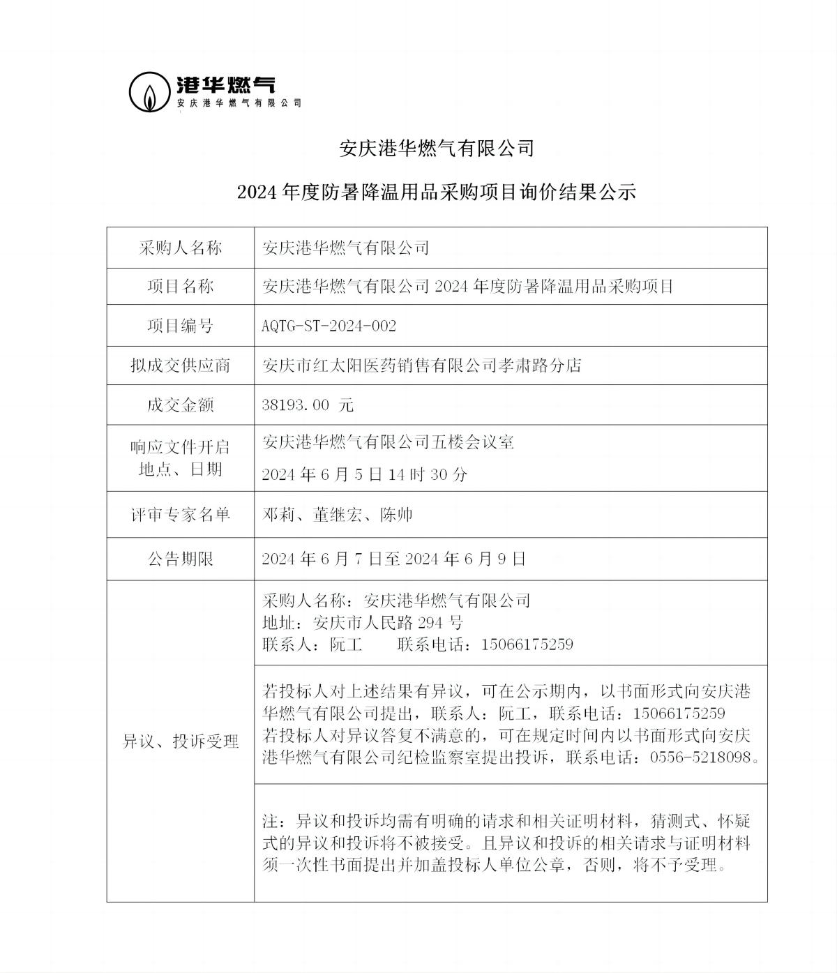 安慶港華燃?xì)庥邢薰?024年度防暑降溫用品采購(gòu)項(xiàng)目詢價(jià)結(jié)果公示