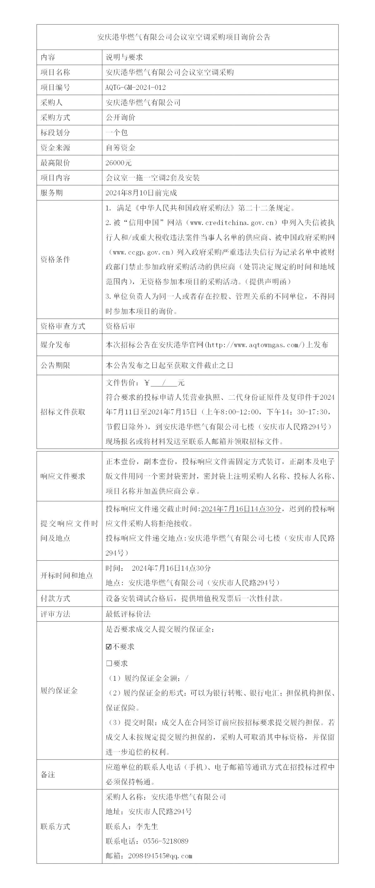 安慶港華燃氣有限公司會議室空調(diào)采購項目詢價公告 發(fā)布時間:2024-07-12    閱讀次數(shù):3414次