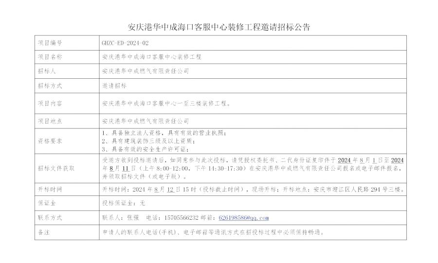 安慶港華中成??诳头行难b修工程邀請招標(biāo)公告 發(fā)布時間:2024-07-30    閱讀次數(shù):3244次