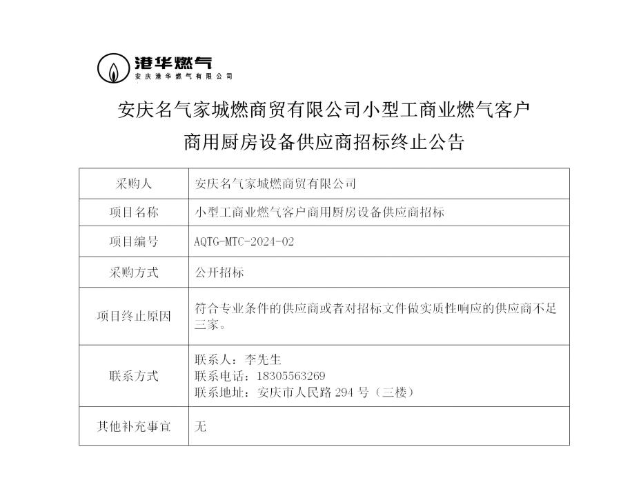 安慶名氣家城燃商貿(mào)有限公司小型工商業(yè)燃?xì)饪蛻羯逃脧N房設(shè)備供應(yīng)商招標(biāo)終止公告