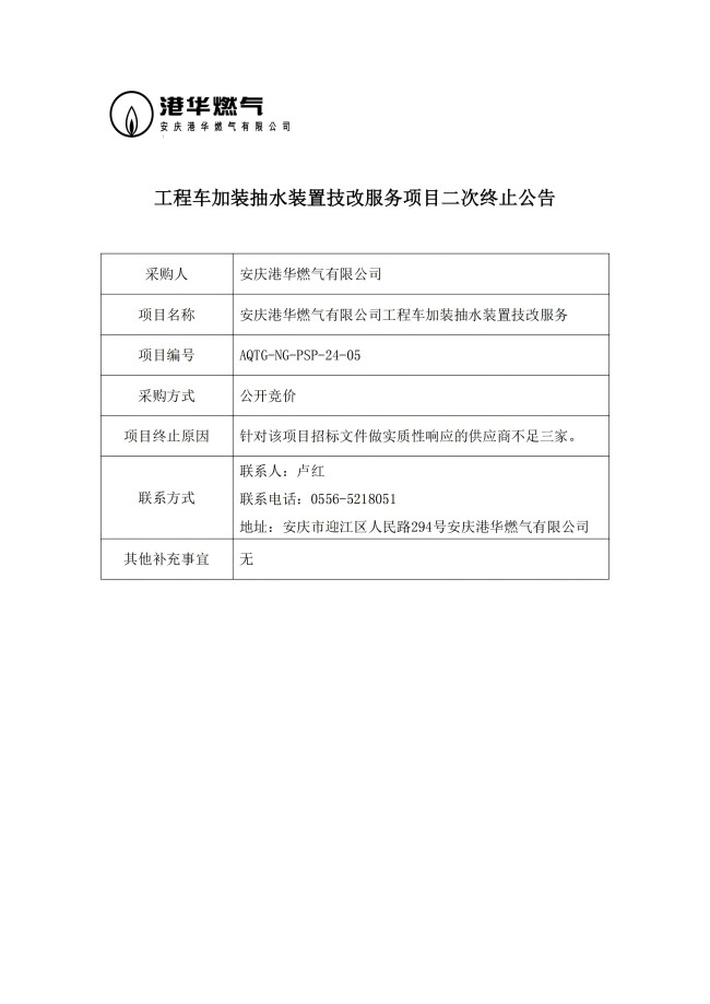 工程車加裝抽水裝置技改服務(wù)項目二次終止公告 發(fā)布時間:2024-11-01    閱讀次數(shù):3208次