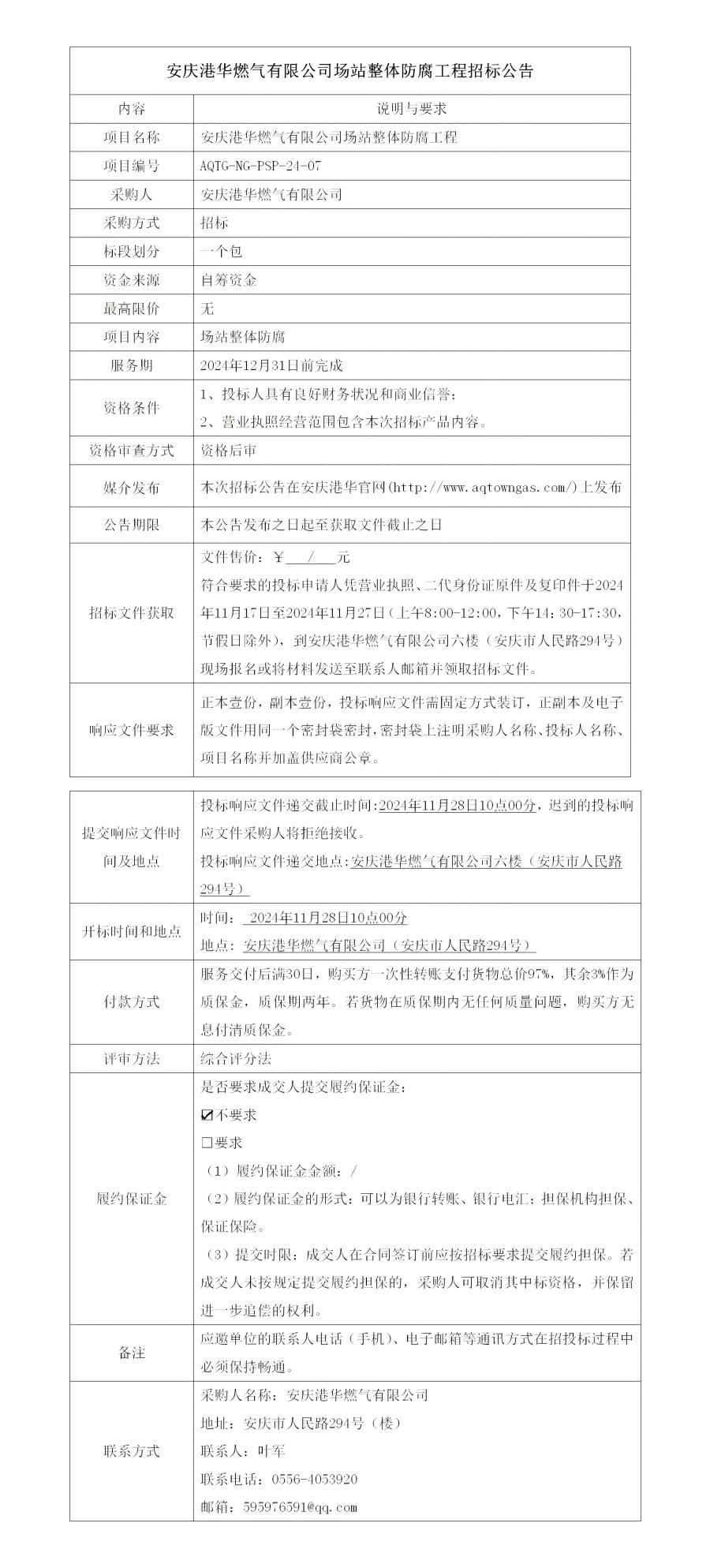 安慶港華燃氣有限公司場站整體防腐工程招標公告 發(fā)布時間:2024-11-15    閱讀次數(shù):4007次
