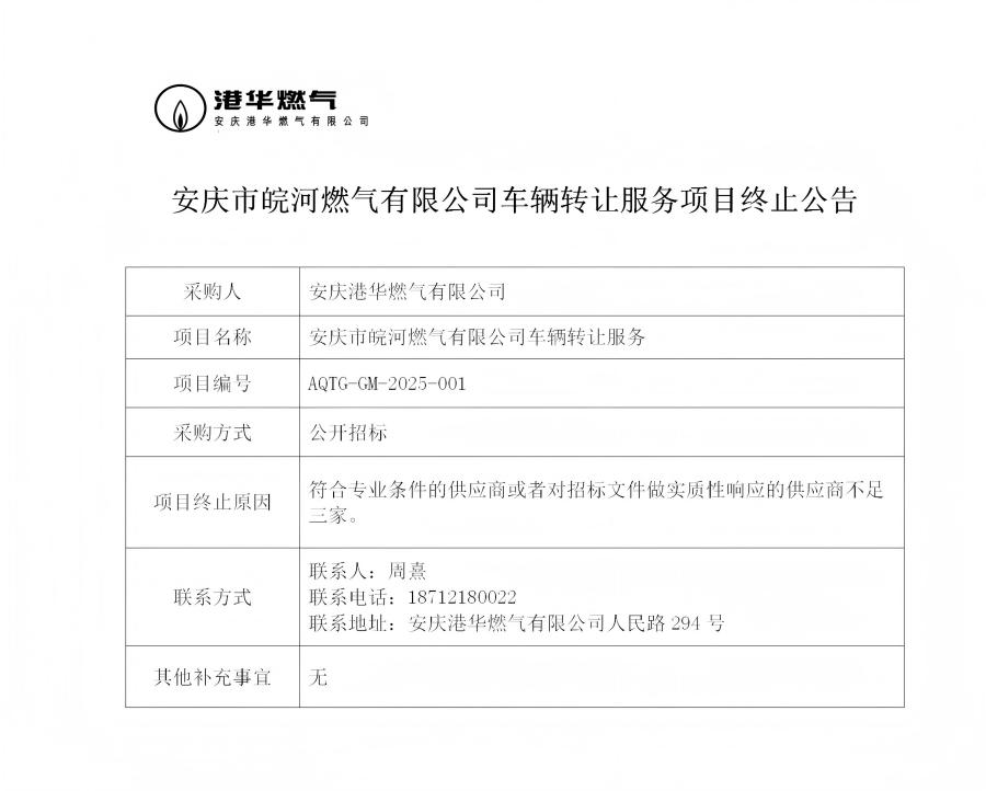 安慶市皖河燃?xì)庥邢薰拒囕v轉(zhuǎn)讓服務(wù)項(xiàng)目終止公告 發(fā)布時(shí)間:2025-01-08    閱讀次數(shù):2496次
