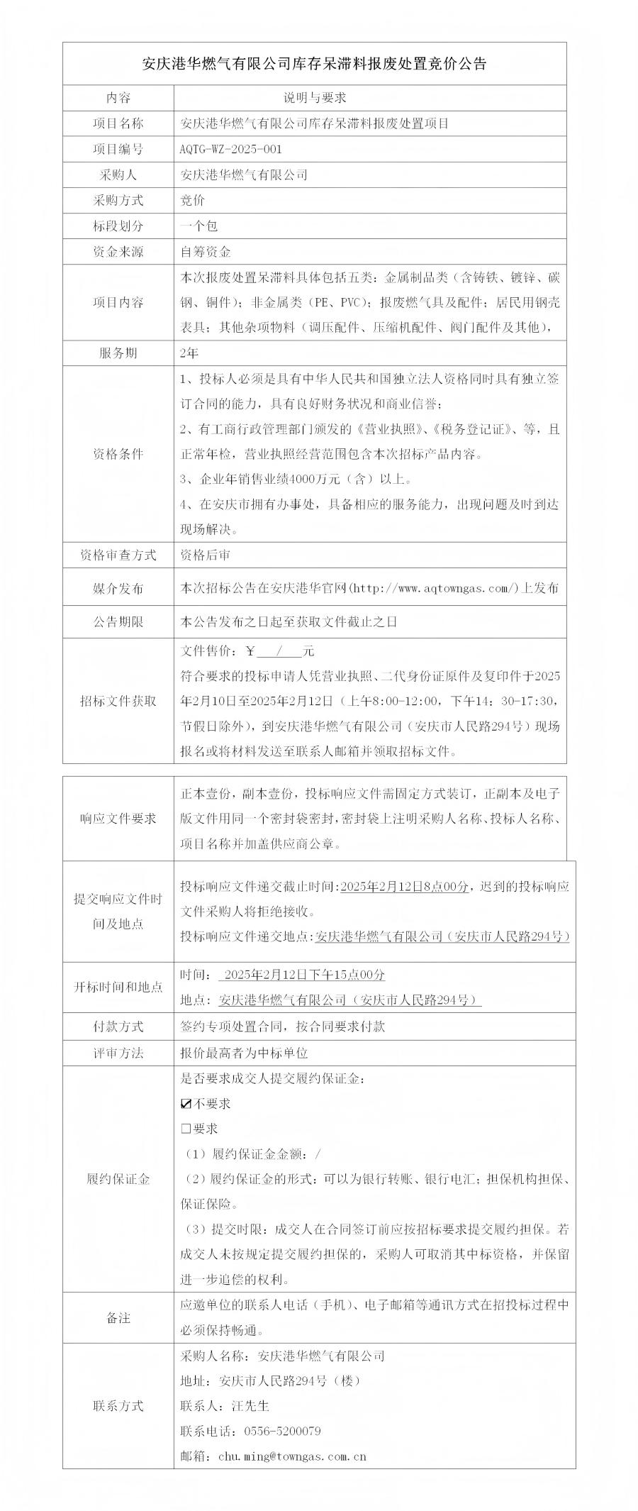 安慶港華燃?xì)庥邢薰編?kù)存呆滯料報(bào)廢處置競(jìng)價(jià)公告 發(fā)布時(shí)間:2025-02-10    閱讀次數(shù):2445次