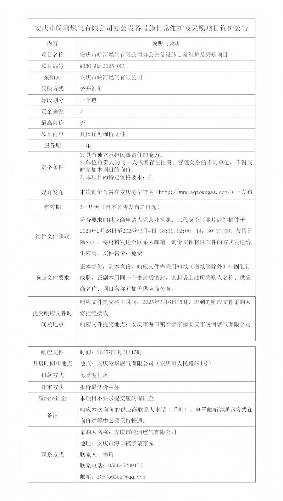 安慶市皖河燃?xì)庥邢薰巨k公設(shè)備設(shè)施日常維護(hù)及采購(gòu)項(xiàng)目詢(xún)價(jià)公告