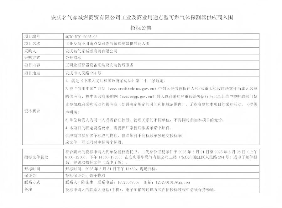 安慶名氣家城燃商貿有限公司工業(yè)及商業(yè)用途點型可燃氣體探測器供應商入圍招標公告