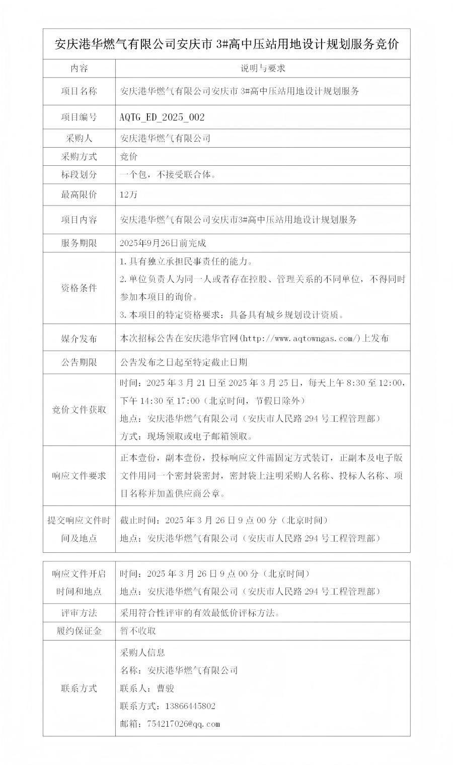 安慶港華燃?xì)庥邢薰景矐c市3#高中壓站用地設(shè)計規(guī)劃服務(wù)競價