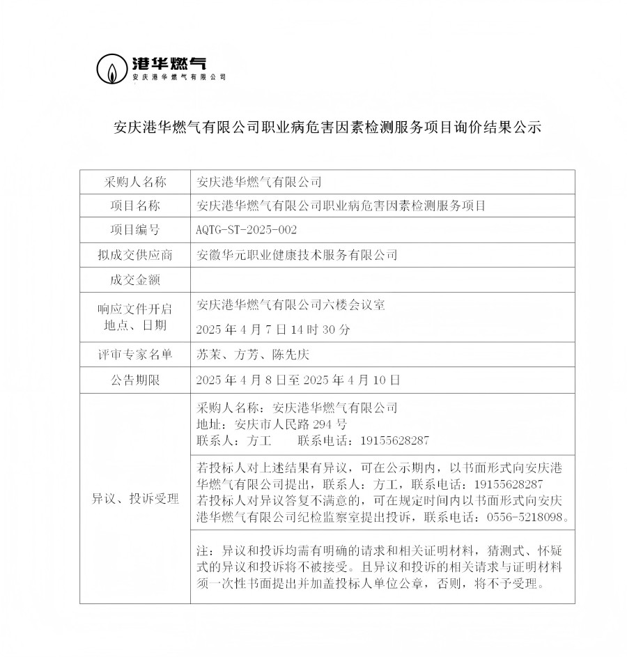 安慶港華燃?xì)庥邢薰韭殬I(yè)病危害因素檢測服務(wù)項目詢價結(jié)果公示