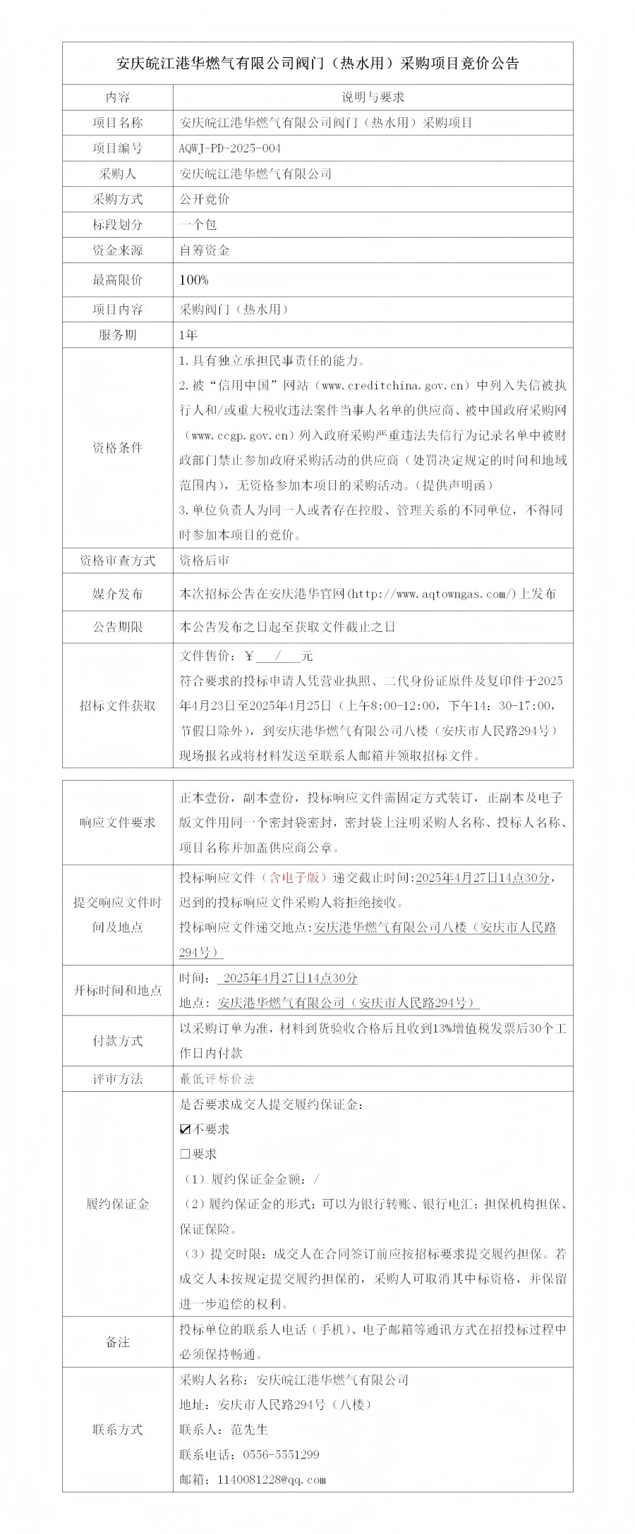 安慶皖江港華燃?xì)庥邢薰鹃y門(mén)(熱水用)采購(gòu)項(xiàng)目競(jìng)價(jià)公告 發(fā)布時(shí)間:2025-04-23    閱讀次數(shù):1728次