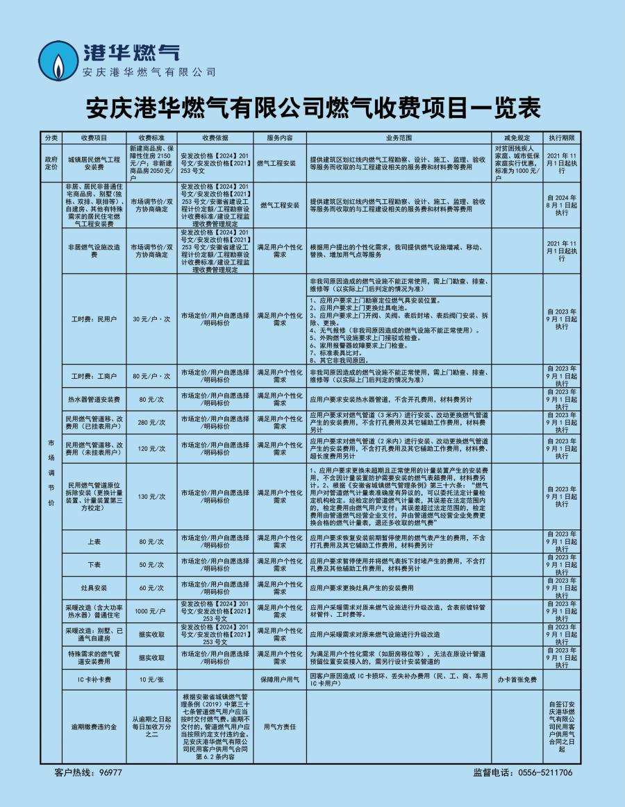 安慶港華燃?xì)庥邢薰臼召M(fèi)項(xiàng)目一覽表(2025)