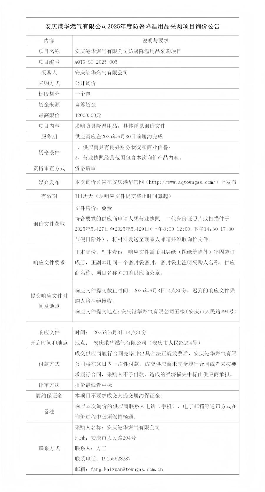 安慶港華燃?xì)庥邢薰?025年度防暑降溫用品采購(gòu)項(xiàng)目詢(xún)價(jià)公告