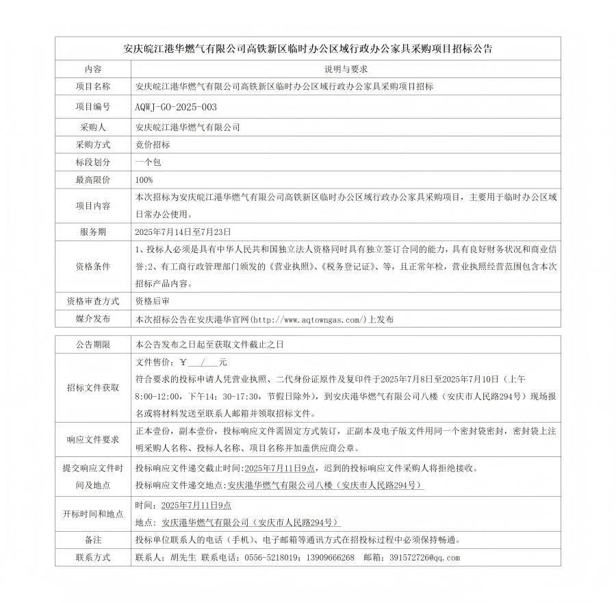 安慶皖江港華燃?xì)庥邢薰靖哞F新區(qū)臨時辦公區(qū)域行政辦公家具采購項目招標(biāo)公告
