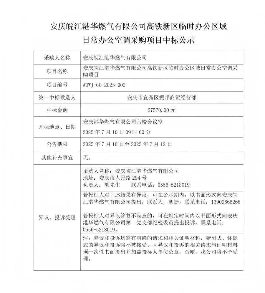 安慶皖江港華燃氣有限公司高鐵新區(qū)臨時辦公區(qū)域 日常辦公空調采購項目中標公示